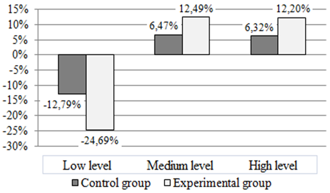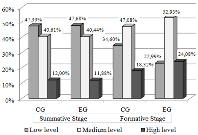 After the formative stage of the pedagogical experiment (Figure 2), the number of students with high level of ecological competence increased by 12.02 %, and among the students with medium level by 12.49 % (in CG, 6.32 % and 6.47 %, respectively). In addition, compared to CG, the percentage of students with low levels of environmental competence has significantly reduced. In particular, the number of students with low levels of environmental competence decreased by 24.69 % in the EG, and only by 12.79 % in the CG.