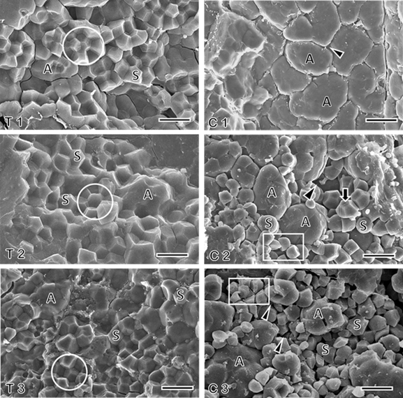 Figure-2. Accumulation structure of brown rice grains of Akitakomachi (T1, C1), IR-28 (T2, C2), and NERICA-4 (T3, C3) under scanning electron microscopy. T: transparent grain, C: chalky grain. A: amyloplasts, S: starch granules, arrow: dent portions and arrowhead: air gaps. Scale bar: 10 µm. White circles display the polyhedral shape of starch granules grouping into amyloplasts without air gaps. White rectangles display loosely developed starch granules together with the single round shape and multiple size and shape of starch granules with numerous air gaps.