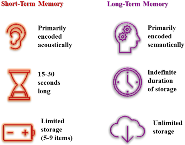 Storage refers to how, where, and for how long the information encoded in the memory system is retained. According to Roediger and McDermott [27], storage highlights the existence of two types of memory: short-term memory and long-term memory. The encoded information is first stored in short-term memory, and then, if necessary, stored in long-term memory.