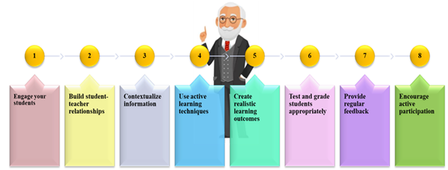 Students are easily distracted from class, especially within an online teaching environment, see Figure 2. There are two types of motivation that may influence how students can be engaged in the learning experience: intrinsic, which refers to the motivations that originate internally; and extrinsic motivation, which refers to external factors that influence student performance and motivation. Bain [34] identifies numerous evidence-based strategies that teachers can use to motivate their students. Eight of these strategies are listed in Figure 3.