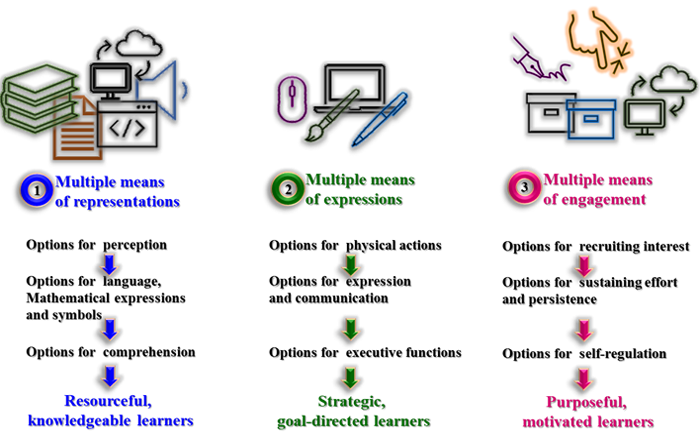 Multiple means of representation through which information can be presented to students. This is based on the multitude of ways in which students perceive and understand information, due to a variety of physical, cognitive, and psychosocial reasons that exist on a spectrum or continuously. This principle also looks at the teaching methods used to ensure that all students have access to the ways concepts and ideas are emphasized, connections are made, and questioning is modeled [39].