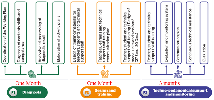 Contemporaneous researchers [46] from Spain and Peru have proposed an ambitious plan for transitioning from on-campus teaching and learning to the online mode. The timeline proposed in Figure 6 might be implemented. However, the opinion of the present research is that the proposed timing is too tight, given that the entire study plan must be shifted to online mode. Professors, academic staff, and students have to familiarize themselves with new technologies and changes to their study plan (especially in terms of teaching, assessment, and evaluation techniques).
