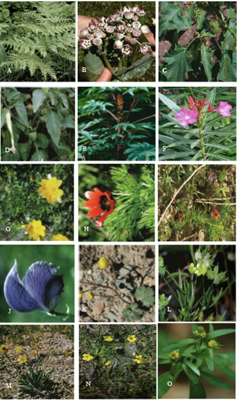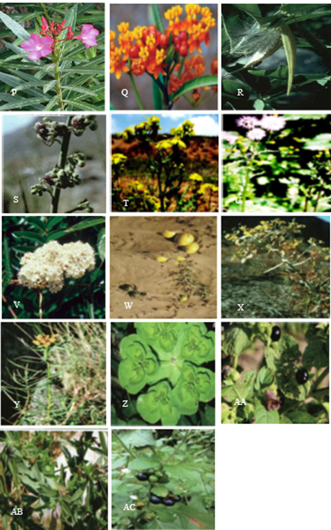 Figure-1. Photos of the poisonous plants that can be found in Afghanistan. A: Pteridium aquilinum, B: Calotropis procera, C: Datura innoxia, D: D. stramonium, E: Ricinus communis, F: Nerium indicum, G: Aconitum rotundifolium, H: Adonis aestivalis, I: A. scrobiculata. J: A. turkestanicus, K: Ranunculus afghanicus, L: R. arvensis, M: R. longicaulis, N: R. pulchellus, O: R. sceleratus, P: Catharanthus roseus, Q: Asclepias curassavica, R: Cynanchum acutum, S: Periploca aphylla, T: Senecio glaucus, U: S. vulgaris, V: Sambucus wightiana, W: Citrullus colocynthis, X: Euphorbia boissieriana, Y: E. cyrtophylla, Z: E. helioscopia, AA: Atropa acuminata, AB: Hyoscyamus niger, AC: Solanum nigrum[4, 29, 38