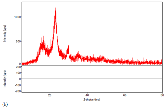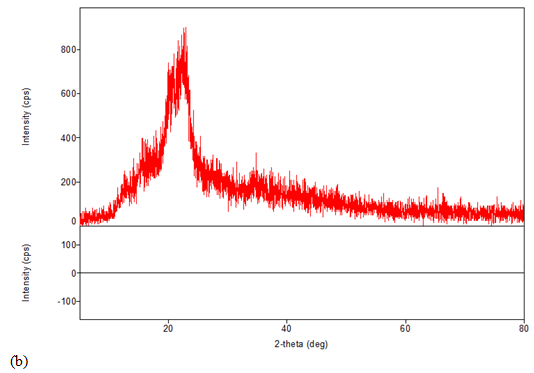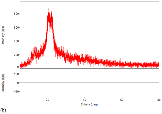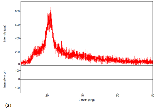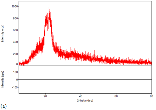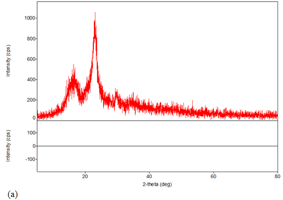 Figure 3 with a duration of 6 hours at a 10% concentration revealed three peaks in the 2θ diffractogram 2θ = 13.22, 20.88, and 22.56, and structural characteristics of cellulose containing approximately 25.44% crystalline and 74.56% amorphous content. Figure 3 revealed three peaks in the 2θ diffractogram for 15% NaOH with a 2-hour duration variant of about 2θ = 13.46, 20.46, and 21.82, and the structural characteristics of cellulose containing approximately 24.51% crystalline and 75.49% amorphous content. Figure 3 showed three peaks in the 2θ diffractogram for 15% NaOH with 4-hour duration variants of about 2θ = 13.48, 20.52, and 21.94, and the structural characteristics of cellulose were approximately 22.46% crystalline and 77.54% amorphous content. With a duration of 6 hours at 15% NaOH concentration revealed three peaks in the 2θ diffractogram 2θ = 12.58, 20.78, and 22.08, and structural characteristics of cellulose containing approximately 20.32% crystalline and 79.68% amorphous content. Table 1 explained that the maximum amorphous content was obtained at 15% NaOH concentration with a duration of 6 hours.