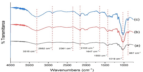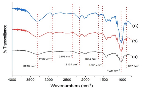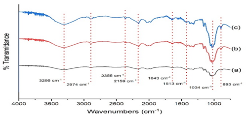 Figure 6. FT-IR spectrum of nanocellulose waste paper for (a) 5% NaOH, (b) 10% NaOH, and (c) 15% NaOH for a 2-hour duration.