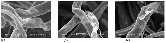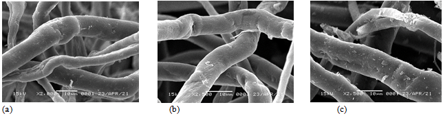 Figure 9. SEM results of 2500X 15% NaOH with heating durations of (a) 2 hours, (b) 4 hours, and (c) 2 hours.