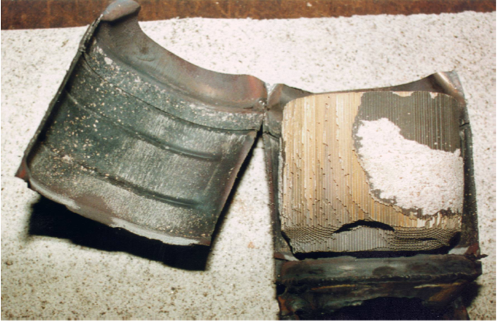 To improve the performance of various experimental and numerical studies have been performed by researchers. Mehdi, et al. [16] developed a computational model to investigate the interaction of urea droplets with exhaust gas and its impacts. It shows the uniformity of flow velocity, uniformity of ammonia distribution in the catalyst, and temperature distribution are among the performance parameters. Flow maldistribution at the catalyst's front face causes bigger ageing effects in these zones, resulting in worse overall species conversion efficiency. Lu, et al. [17] proposed a new mixer design for diesel engines. It was observed that by employing this mixer, urea droplets fully mixed with flue gas and increased NOX conversion efficiency, with velocity uniformity index and ammonia uniformity index of 0.98 and 0.95, respectively. Budziankou, et al. [18] studied the impact of urea droplets on the wall of the exhaust pipe and the formation of liquid film experimentally on an engine test bench. The liquid film formation is observed by IR thermography. This liquid film is responsible for creating the back pressure, which ultimately reduces the engine efficiency. Similar results were recorded by Qian, et al. [19]. Hence, a proper urea injection system is important. Jain, et al. [20] performed the numerical analysis and observed that the injection angle had a key impact on urea decomposition. Chen, et al. [21] performed experimental and numerical analysis to reduce the urea deposits formation. Studies show that liquid film formation can be reduced by proper urea injection pressure, injection angle, and injecting the urea with high turbulence intensity. Chen and Williams [22] used CFD-based intake cone design to optimise flow distribution. The flow distribution of the catalytic converter across the substrate should be uniform, because it provides more surface area for chemical reactions. Figure 2 depicts a substrate whose face was eroded as a result of non-uniform exhaust flow. The regular flow distribution also influences the durability of the substrate and support mat [23].