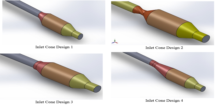 As seen in Figure 5 above, in the intake cone design 1, the intake cone shape was made divergent with little downward offset. In the intake cone design 2, to create swirl motion, the intake pipe was twisted and the intake cone shape was kept divergent. In intake cone design 3, the catalyst diameter was increased at the inlet section along with the cone length. In the intake cone design 4, the pipe was bent downward to create a downward offset and the intake cone length was increased.