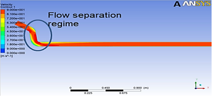 The estimated flow fields are displayed in various sections of the current pipe. The velocity contour for load case A is shown in Figure 6 in the x-direction at a symmetric cross-section parallel with the inlet flow direction. For the case A, the flow separation occurs at the bends which result in high energy loss. Flow separation is highly undesirable because it will lead to improper mixing of UWS with exhaust gas. After the bend section of pipe, the flow is getting more uniform as the flow advances in x-direction.