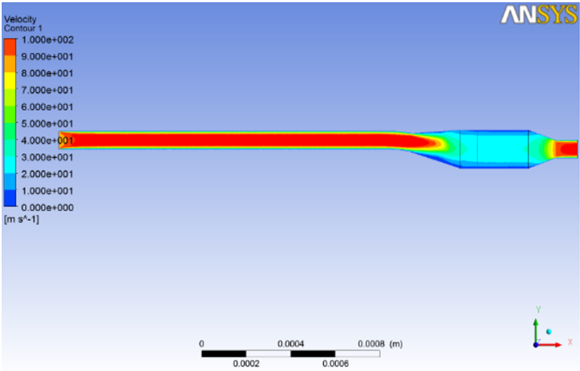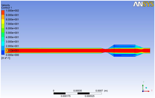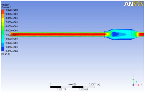 For the intake cone 2 as shown in Figure 10, velocity is very higher at the centre of the substrate, which results in non-uniform distribution of flow. As the flow enters in porous zone, it aligns with the channel direction and flows with maximum velocity at centre of substrate. The flow is separated at the wall of cone and forms small recirculation zones. The flow uniformity increases slightly at centre compared to first intake cone.