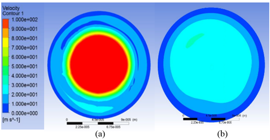 Figure 13.Flow velocity contour maps at mid-section of the catalyst (a) existing SCR model, (b) Intake Cone design 4.