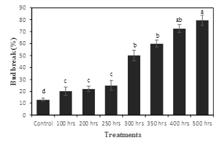 The results showed that there was a significant difference between the control (no cooling) and chilled treatments except for the 100 and 200 hrs chilling treatment. Amongst the treatments, the lowest percentage of buds opening was shown at 100 hrs; whilst the highest was recorded at 400 and 500 hrs. The findings indicate that extended chilling duration increased buds breaking percentage (Figure 1).