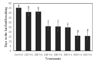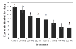 The effect of different levels of chilling on the time interval to the last buds breaking was significant between the control (no chilling) and the 100 hrs, 250 hrs, and 400 hrs treatments. However, the time to the last buds opening was reduced by increasing the cold duration. In the case of total bud breaking, no significant differences were realized in 100 with the control, 200, 250 with 350, and 400 with 500 hrs of cold treatments. (Figure 4).