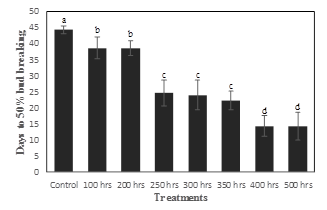 Figure-3. Effect of chilling duration on the number of days to the 50% bud breaking in grapevine cv.̔ Aabjosh.