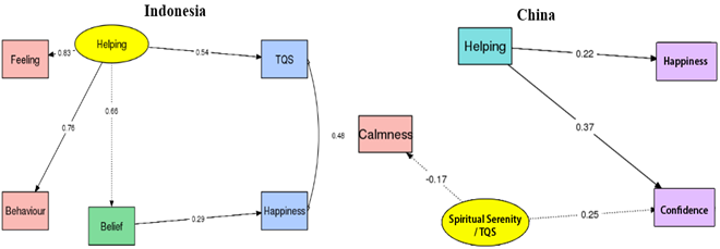 As shown in Table 2, the results of the correlation test for the sample of Chinese students differ from the results of the Indonesian students. In the sample of Chinese students, helping was found to be correlated with happiness (r = 0.224*) but not with spiritual serenity (r = 0.159); however, helping was found to be correlated with PoM (r = 0.256**). Spiritual serenity based on TQS is not influenced by any external variables. Although confidence is a dimension of calmness, it has a positive relationship with helping (r = 0.368**) and other external variables. As a result, the model that was tested had the following characteristics: helping can be a predictor of happiness and of confidence, which is one of the dimensions of spiritual serenity. Concerning the sample of Indonesian students, belief (one of the helping dimensions) was found to be a predictor of happiness. Helping also served as a predictor of spiritual serenity (see Table 1).