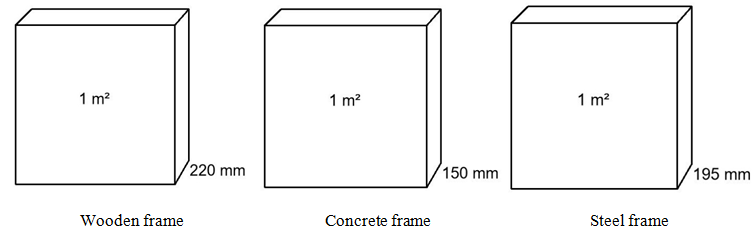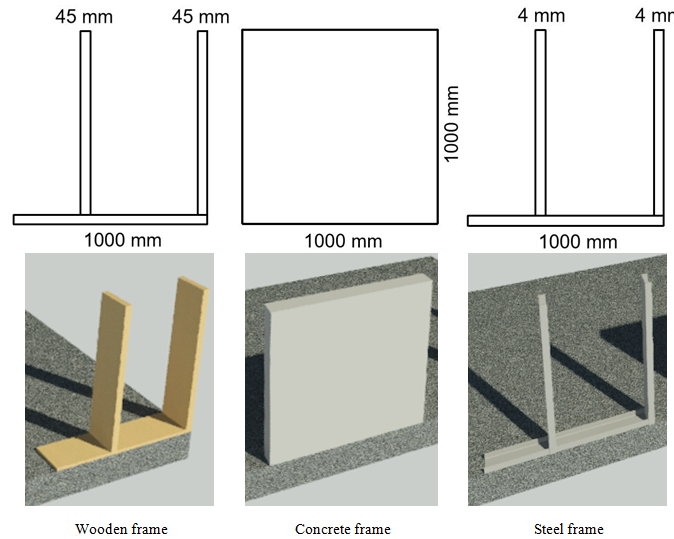 Figure 1 illustrates typical walls with an area of 1 m2. The thickness of the walls differs due to the load-bearing properties of the different materials. Further details of these typical walls are displayed in Figure 2. As the figure shows, the wooden wall consists of two wooden studs and a wooden sill with dimensions of 45 mm × 220 mm. The concrete wall is a block of pure concrete with dimensions of 1000 mm × 150 mm. The steel wall includes two steel studs and a steel sill with dimensions of 4 mm × 195 mm.
