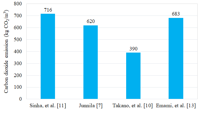 Sinha, et al. [11] studied the carbon dioxide emissions from a concrete building in Stockholm, Sweden. The carbon dioxide emissions were based on three different LCA databases: SimaPro, GaBi, and ELP. The carbon dioxide emissions from the building's concrete differed and were stated in the unit kg CO2/kg. Also, the carbon dioxide emissions from three different buildings were investigated by Junnila [7]. The most suitable of these three buildings, case B, was selected for this research. The frame accounted for 3% of the building's total carbon dioxide emissions, where the total carbon dioxide emissions were 3100 kg CO2/m2. As a result, the concrete frame of the building emitted a total of 93 kg CO2/m2 in Finland. Takano, et al. [10] analysed the carbon dioxide emissions from a concrete frame in Finland. They recorded the carbon dioxide emissions of 74 kg CO2/m2 for the concrete frame. Another study on the carbon dioxide emissions from a concrete building in Finland was conducted by Emami, et al. [13]. The proportions of concrete in the building for SimaPro and GaBi were 43% and 33%, respectively.