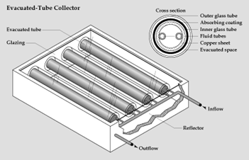 Evacuated tube collectors: Evacuated Tube Collectors (ETCs) can achieve temperatures above 200°C. There are various types of ETCs, and a typical collector is shown on Figure 2. ETCs are typically designed with parallel rows of twin glass tubes, with each inner glass tube containing a metal heat pipe attached to an absorber fin. The air between the two glass tubes is removed (or evacuated) to form a vacuum, which reduces conductive and convective heat loss [5].
