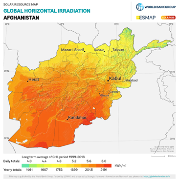 Afghanistan on average has 300 sunny days can take benefit from this bulk amount of solar energy by employing different technologies. Solar energy has the most potential among all renewable energy sources in Afghanistan, which is abundant and environmentally friendly. Afghanistan can potentially produce 220,000 MW of solar power with 300 sunny days each year and can generate 6.5 kWh/m2. The southern and western parts of Afghanistan receive even more direct sunlight and can potentially generate 1022 KW/m2/year or more with the installation of concentrating solar power (CSP) which is indicated in Figure 3 [7].