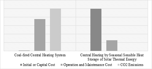 The initial or capital cost, operating or running cost and maintenance cost of central heating by seasonal sensible heat storage of solar thermal energy is found as below and the environmental consideration (emissions analysis) of this system is also performed. Finally, the results are presented. In this part, the initial/capital cost central heating by seasonal sensible heat storage of solar thermal energyis calculated by some following analytical formulas. For this purpose, the water equivalent can be found by Equation 8 and Equation 9 [14].