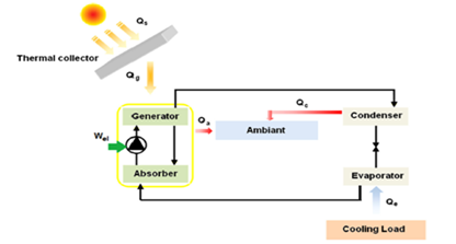Absorption solar air conditioner is the most common type and globally in use among the thermally driven machines [5] ]. It works based on the absorption and refrigeration cycle. The best-selected refrigeration with the highest coefficient of performance (COP) is a mixture of water and lithium-bromide (H2O-NH3) for the absorption cycle. Figure 2 shows a schematic view of the solar sorption Refrigeration cycle [22