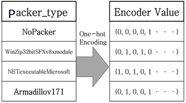 Figure 2. Example of one-hot encoding method used to process pe_packer features.