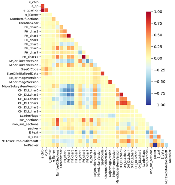 Figure 3 shows the overall pe_header features by visualizing the correlation coefficients. Here, only 45 columns, including e_cblp, which have a range of correlation coefficients from 0.0 to 0.3 with the class, were separately extracted and used as the pe_top features.
