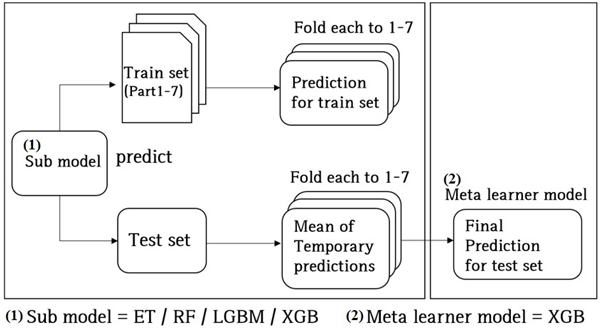 The CV-based stacking method employs the K-fold cross-validation method, in which a training dataset of each sub-model is divided into K datasets, and tests are conducted K times. After defining each sub-model, the sub-model is trained with the training data set divided by the fold. The prediction of the validation data set is conducted to perform the K-fold averaging prediction that produces the prediction result. After each model is predicted K times, the average of the prediction value is designated as the resultant prediction value (mean of temporary predictions). The generated resulting prediction value is used as the training data of the meta learner to conduct the model training. After this, the prediction is finally performed using x_test, which is then compared using y_test to evaluate the final model.