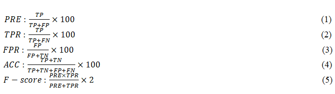 The performance evaluation indicators are described before presenting the experimental results. In this study, precision (PRE), true positive rate (TPR), false positive rate (FPR), accuracy (ACC), and F-score were compared as the measures of the performance evaluation. PRE refers to the proportion of detected malware files to actual malware files Equation 1. TPR refers to the ratio of actual malware files that are accurately detected. The larger the value is, the better the system is Equation 2. FPR refers to the proportion that true benign files are seen as malware files. This is different from other evaluation scores as the lower the value is, the better the system is Equation 3.