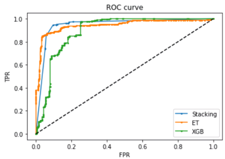 Figure 5.ROC Curves of ET and XGB single models and stacking model.