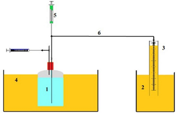 Figure-3. Biogas batch system (1. fermenter, 2. mini water bath, 3. gas holder, 4. thermostatic water bath, 5. volve, 6. gas transfer tube).
