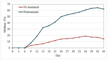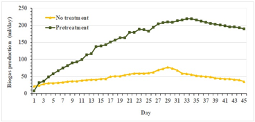 ]. In addition, the digestion of multiple substrates in the same digester can result in positive synergism, and the additional nutrients can aid microbial growth. In this study, biogas production results were shown in Figure 4. The biogas production was highest about 230ml/day on the 35 day with pretreatment. The results reveled that pretreatments improves the biogas yield.