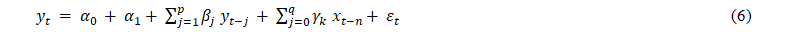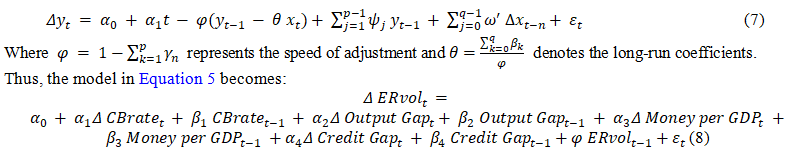Equation 5 describes that exchange rate volatility is explained by central bank policy rate, output gap, money supply and credit gap. Where ERvol is exchange rate volatility (IDR-USD, IDR-SGD, IDR-AUD, IDR-GBP, and IDR-EURO volatilities); CBrate is central bank rate. The econometric methodology used in the model was the multiple regression equation through the application of Autoregression Distribution Lag (ARDL). This model makes it simple to examine both the short- and long-term volatility of ER. The ARDL model (p, q, …, q) which was defined for the same q in the explanatory variables as follows: